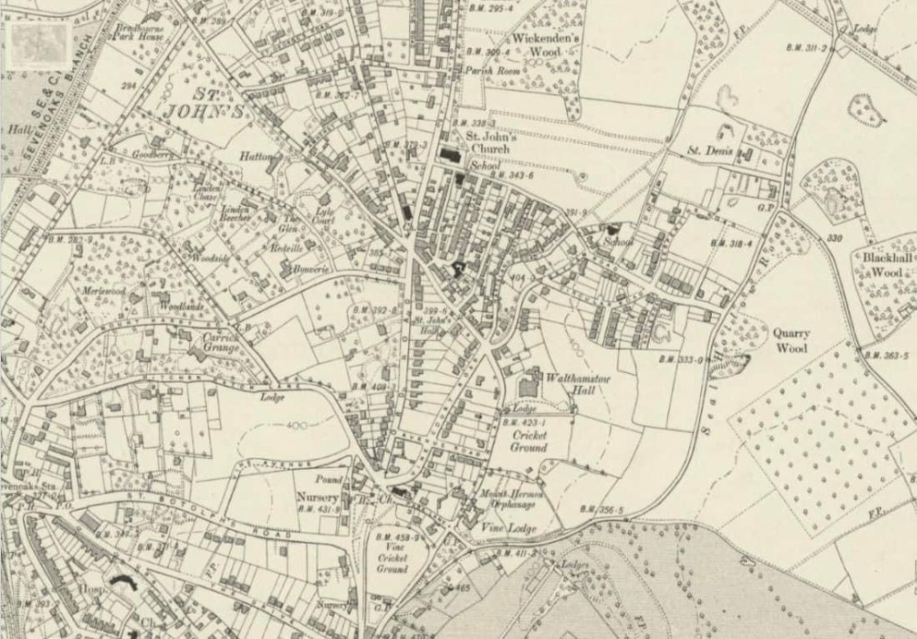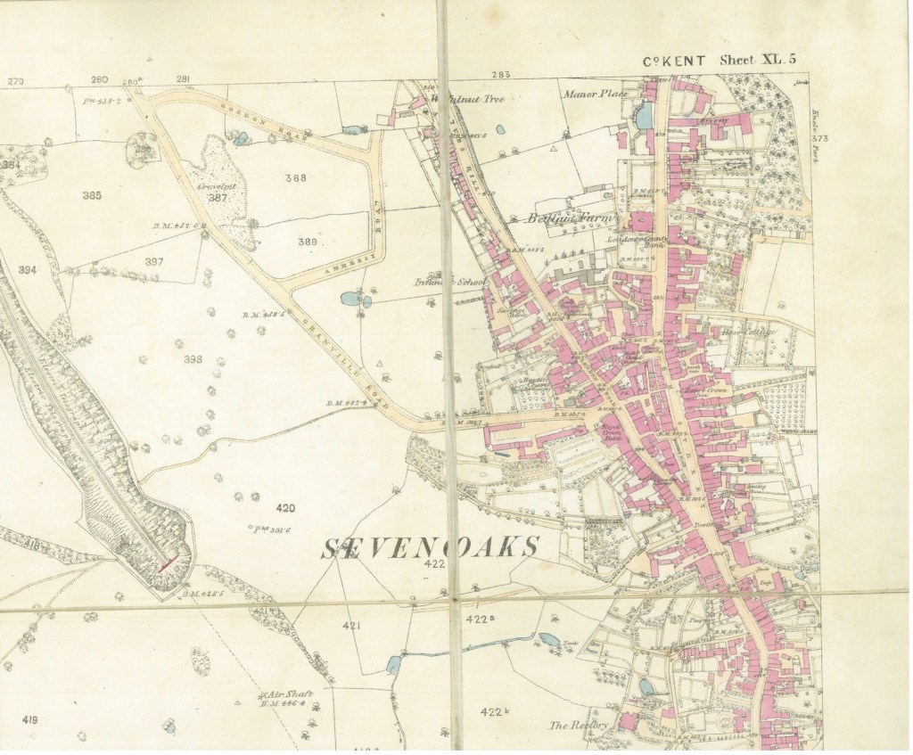 These images are taken from the ordnance survey maps of Sevenoaks dating from 1869/70. The High Street and London Road are instantly recognisable, while some of the maps show just how rural many parts of the area were, with Wickenden Wood and much of Hartslands not yet developed. Much of the building work would follow the advent of the railway, first at Bat & Ball in 1862, and then at Sevenoaks (Tubs Hill) in 1868.